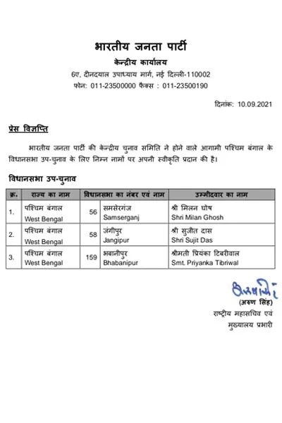 অতঃপর প্রার্থীর নাম ঘোষণা করল বিজেপি। ভবানীপুর কেন্দ্রের জন্য শেষ পর্যন্ত মহিলা প্রার্থীকেই বেছে নেওয়া হল গেরুয়া শিবিরের তরফে। ভবানীপুর উপনির্বাচনে মমতা বন্দ্যোপাধ্যায়ের বিরুদ্ধে বিজেপির হয়ে লরবেন প্রিয়াঙ্কা টিবরেওয়াল।